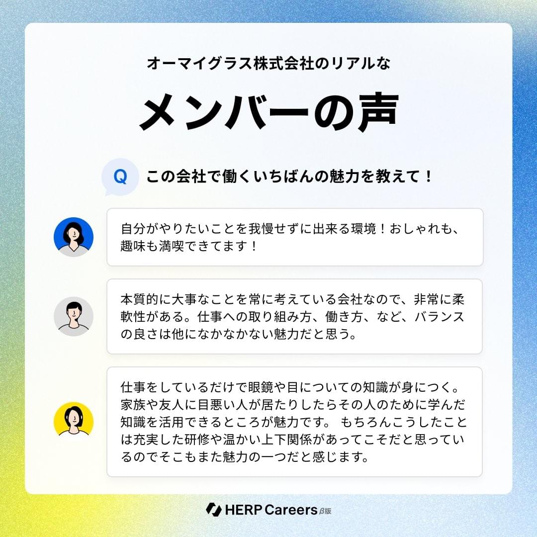 自分の可能性を広げたい方、スキルを身につけて長く働きたい方には、オーマイグラスはぴったりの場所です。